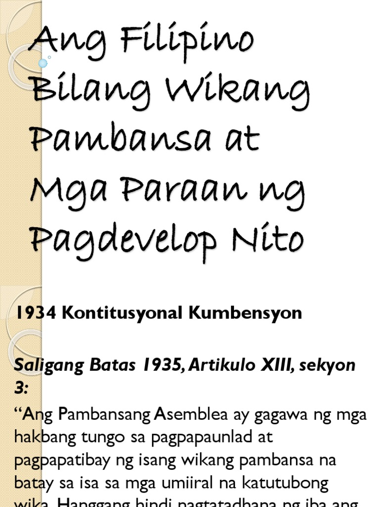 Ang Wikang Pambansapptx from UNKNOWN 124 at Carlos Hilado Memorial State College. Study ANG WIKANG PAMBANSA SA SALIGANG BATAS flashcards from Kim Yesuls class online or in Brainscapes iPhone or Android app. Ito ay pinalitan ng Saligang Batas ng Pilipinas ng 1973 sa ilalim ni Ferdinand Marcos.