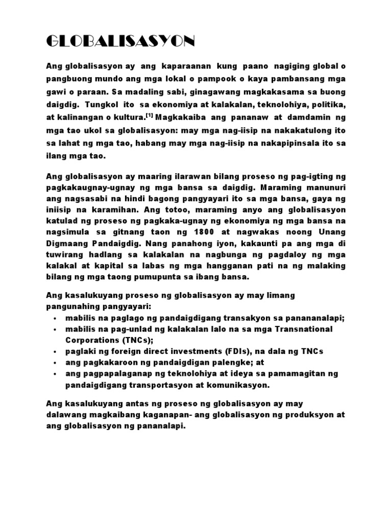 Ang globalisasyon ay ang proseso ng pagsasama at pakikipag-ugnayan ng mga bansa para sa kalakalan komunikasyon at impormasyon. Talaga Kayang Malulutas ng Globalisasyon ang Ating mga Problema. Posted by On May 28 2021 0 Comment On May 28 2021 0 Comment.