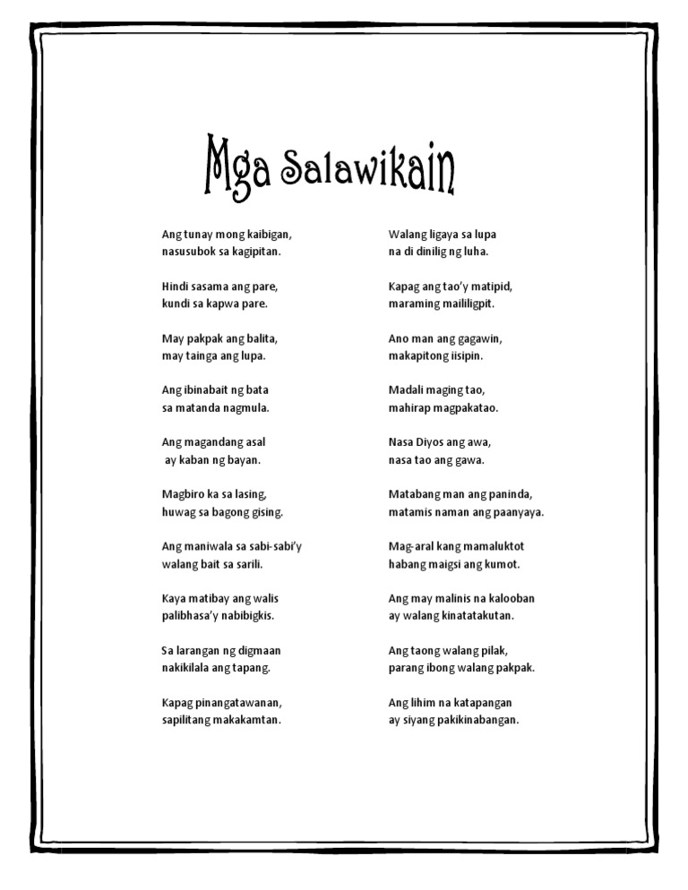 Ang taong walang pilak ay parang ibong walang pakpak. Ang taong mainggitin Lumigaya man ay sawi rin. Ang taong walang kibo nasa loob ang kulo.